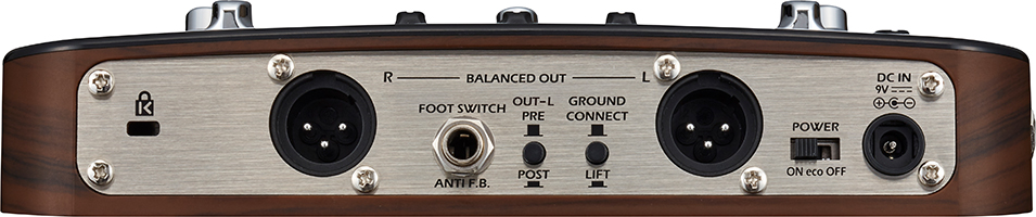 - Két 6,35 mm jack kimenet mono- vagy sztereó csatlakozás gitárerősítőhöz, fejhallgatóhoz vagy audio interfészhez